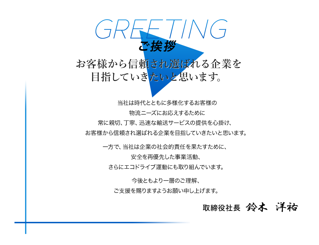 | 所有台数 | 10t ウイング9台 4t ウイング3台 4t冷蔵冷凍車16台 3t ドライ車1台 3t冷蔵冷凍車22台 2t 冷蔵冷凍車10台 軽トラック1台 |